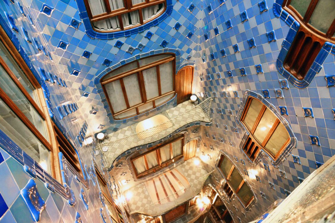 Espagne. Catalogne. Barcelone. Vue de la cour interieure carrelee de faience bleue de la Casa Batllo, edifice moderniste concu par l’architecte catalan Antoni Gaudi de 1904 a 1906. Situee Passeig de Gracia, elle fut construite pour Josep Batllo i Casanovas, industriel du textile // Spain. Catalonia. Barcelona. The blueish inside courtyard of Casa Batllo, a modernist building designed by catalan architect Antoni Gaudi from 1904 to 1906. Located Passeig de Gracia, it was built for Josep Batllo i Casanovas, a textile manufacturer.