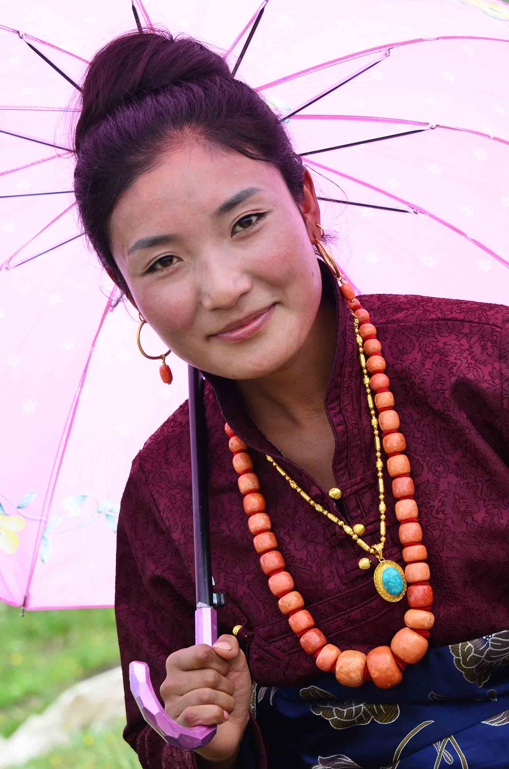 Chine. Tibet. Province de Gansu. Region de l’Amdo. Jeune femme en habit traditionnel et son collier d’ambre avec un parapluie pour se proteger du soleil lors des fetes de Lapste // China. Tibet. Gansu province. Amdo region. Young woman in traditionnal dress with a amber collar and an umbrella to protect her skin from the sun during the Lapste festival.