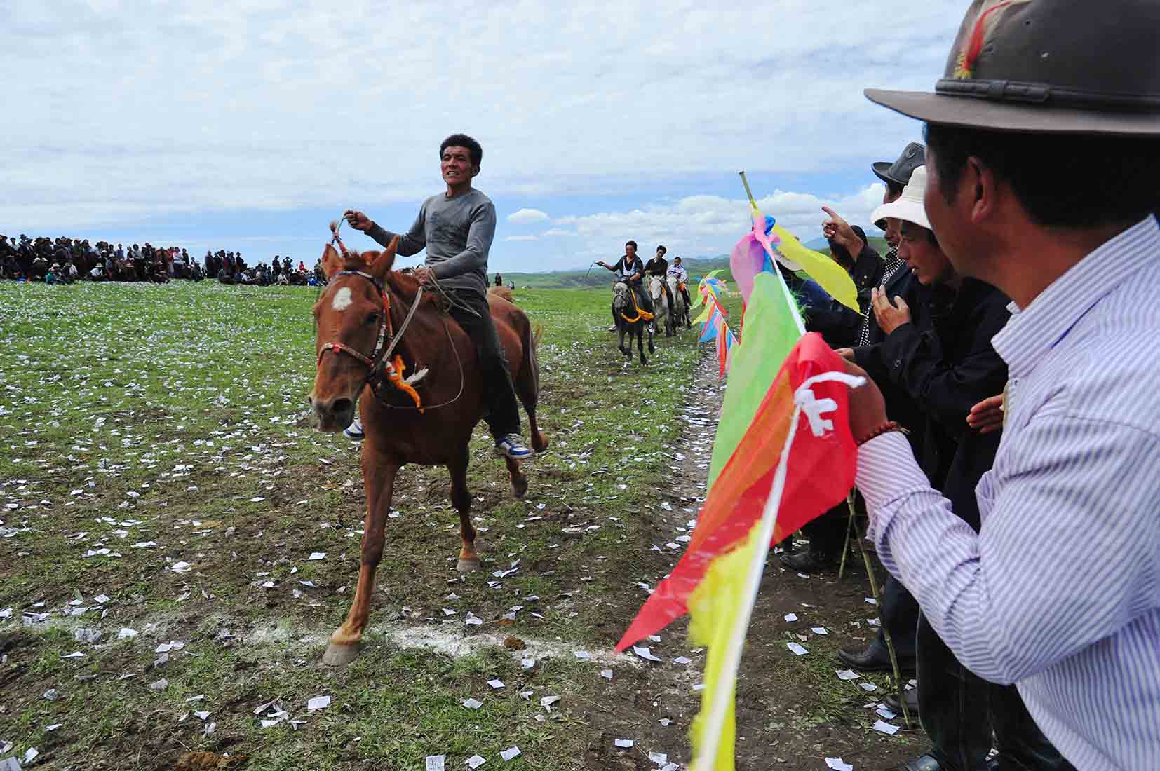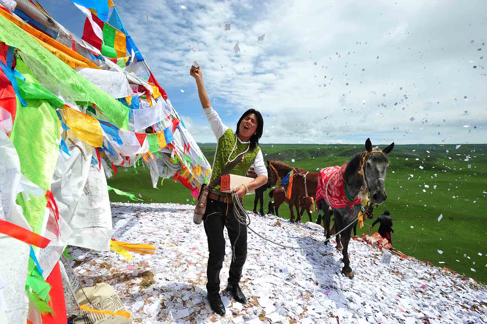 Des chevaux et des yaks paissent un peu partout. Au milieu de la plaine, une colline pointue semble être le seul relief environnant encore couvert de neige. Y grimper nécessite un peu de souffle car, ici à 3 500 m d’altitude dans la province chinoise de l’Amdo, le moindre effort se paie cash. Cette petite ascension est également faite par des Tibétains accompagné de leurs chevaux. Au sommet, le sol et recouvert de milliers de petits carrés blancs, autant de prières dispersées au vent par ces cavaliers qui, dans l’après-midi, prendront part aux courses de Lapsté. En effectuant ce rituel, la chora, ils espèrent attirer les bonnes grâces des dieux et remporter une des courses.