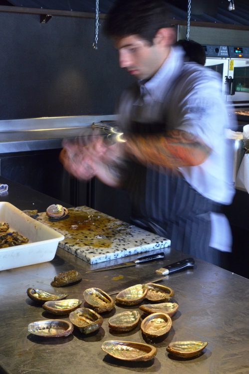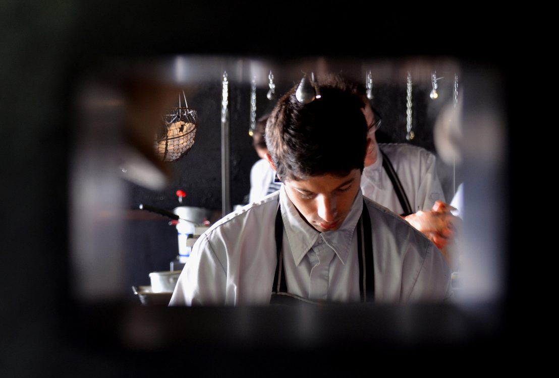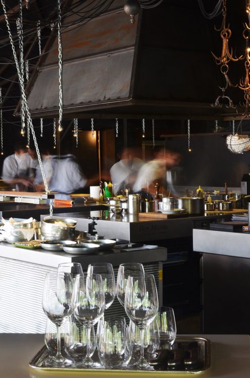 La petite route sinue aux pieds de la ville de Montreuil-sur-mer. Là, adossé aux fortifications élevées par Vauban, le hameau de la Madelaine-sous-Montreuil s’étire le long de la Canche, miroir changeant pour saules pleureurs et peupliers altiers. Au bout du chemin ou presque, un ensemble de belles longères abritent la Grenouillère, la nouvelle adresse gastronomique qui a redonné au Montreuillois toutes ses lettres de noblesse. Plaque d’acier rouillée, panier à œufs customisés sont des signes de piste annonciateurs de plus amples bouleversements. Puis, carreaux de faïences, cheminées en bois, pièces au plafond bas s’effacent soudain devant un long couloir noir. Les lignes s’affinent, s’épurent et se redressent. Un tissu de camouflage en guide de porte et vous voilà transporté au cœur de l’univers d’Alexandre Gauthier, mis en scène par l’architecte Patrick Bouchain. Sur la table, le strict minimum : un couteau posé sur un morceau de poterie signé Jean Lautrey, un verre à pied et une feuille de papier froissé, au texte raturé, le menu. Le parcourir, ou plutôt le déchiffrer, c’est pénétrer l’esprit du lieu, errer avec le chef dans ses tâtonnements propices à la création.
