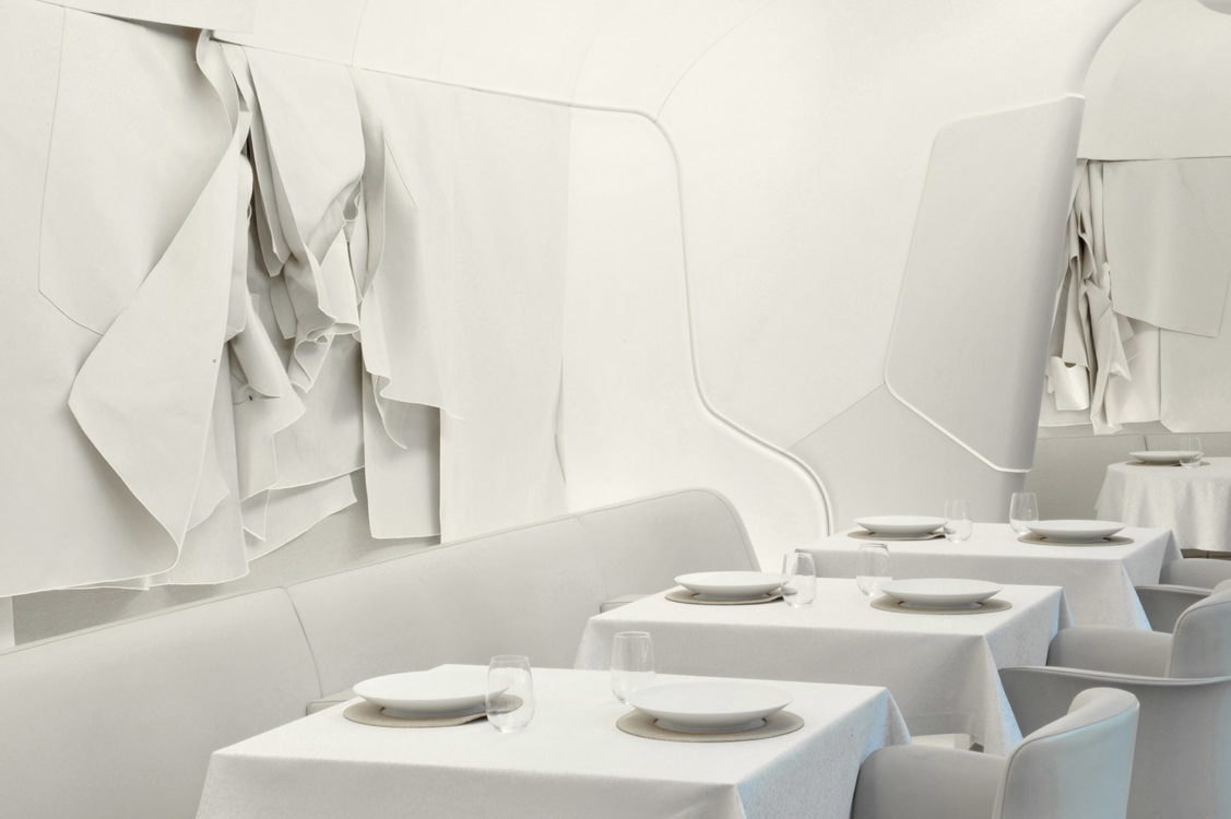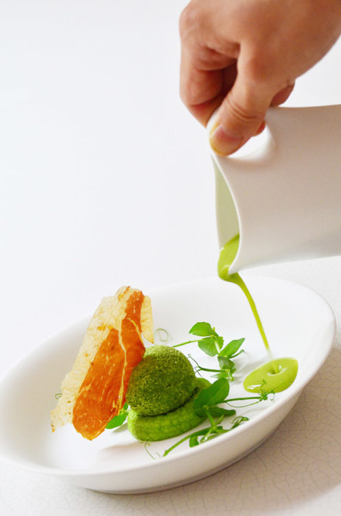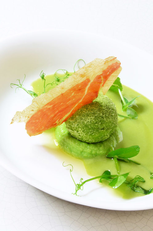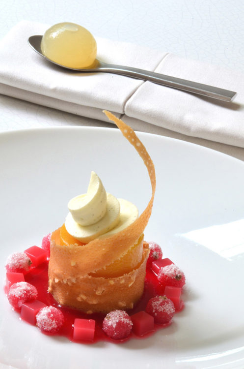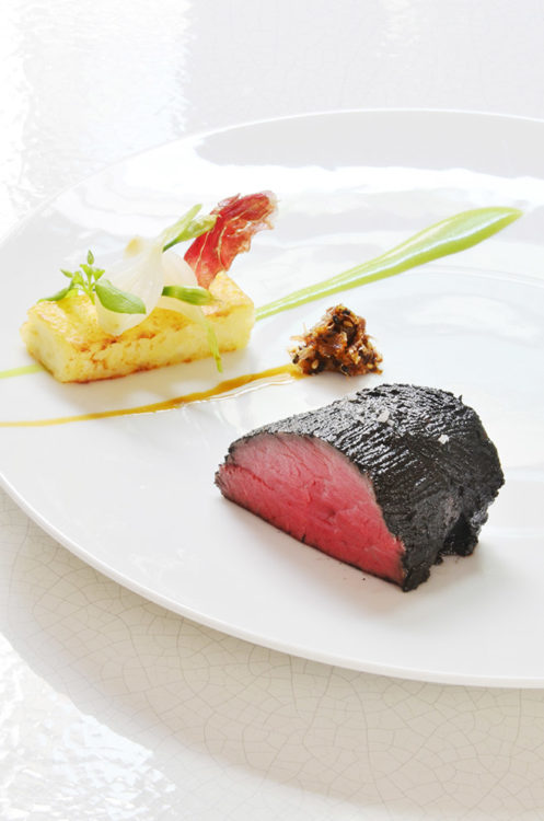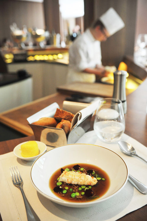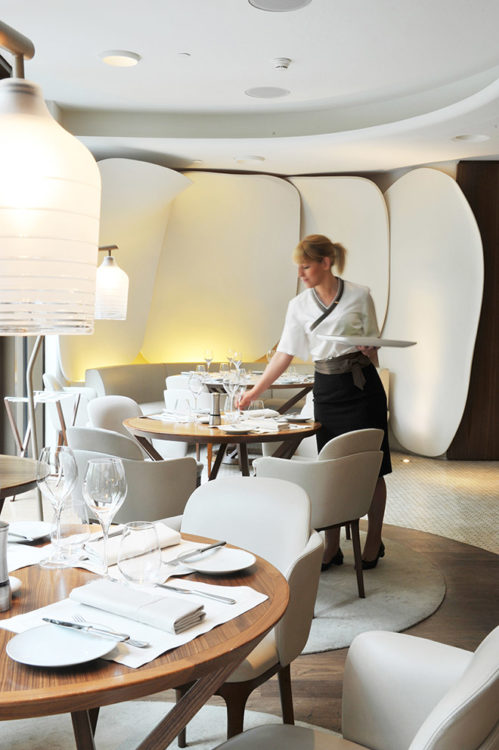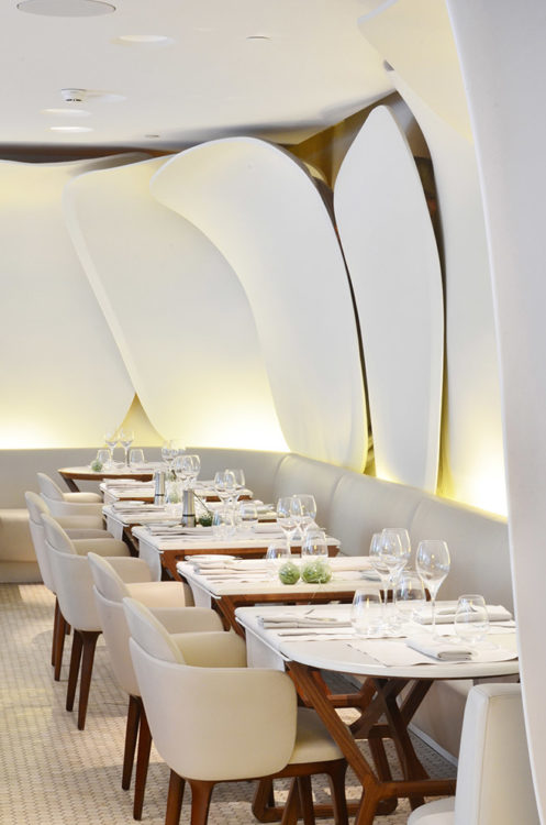 Pour Thierry Marx et son équipe, le défi commence dès potron-minet avec le petit-déjeuner servi au restaurant « Le Camélia », dont la décoration en forme de pétales de fleur est signée Patrick Jouin et Sanjit Manku. « Le Camélia » enchaîne ensuite en salle ou en jardin intérieur, pour le déjeuner. Ici les assiettes se construisent autour d’un produit et se finissent en salle au comptoir. Le tourteau arrive sous forme de ravioles ouvertes condimentées au curcuma sur une crème de févettes froides. Les langoustines et petits pois nagent dans un bouillon thé noir alors que le bar de ligne rôti voisine avec des carottes aux agrumes et coriandre. La dorade à la japonaise, ravioles de navet au citron, toute simple d’apparence, est une merveille de subtilités. Quant à la côte de cochon fermier du Limousin, fricassée de grenailles et petits légumes, jus à la sauge, elle joue délicatement avec les souvenirs d’autrefois, associe cuisine de terroir et nécessaire légèreté d’un déjeuner parisien. C’est le soir, au restaurant « Le Sur-Mesure » que Thierrry Marx donne toute sa mesure ! Dans ce décor éminemment zen, les places sont limitées (42 couverts). Si Thierry Marx s’est un peu assagie question technique, son inventivité reste intacte. L’entrée est placée sous le règne d’un légume (betterave, potiron, petit-pois…) qu’il aime structurer et déstructurer. Le plus simple est de se laisser porter par le menu dégustation. Selon l’humeur du jour et la fraîcheur du marché, pamplemousse semi-pris instantané, huitres frites et caviar, turbot popcorn, homard aux cerises et vieux balsamique, saint-pierre rissolé, gnocchis aux asperges- écume de parmesan ou bœuf charbon- réglisse seront autant d’expériences à vivre, d’émotions à ressentir et à partager.