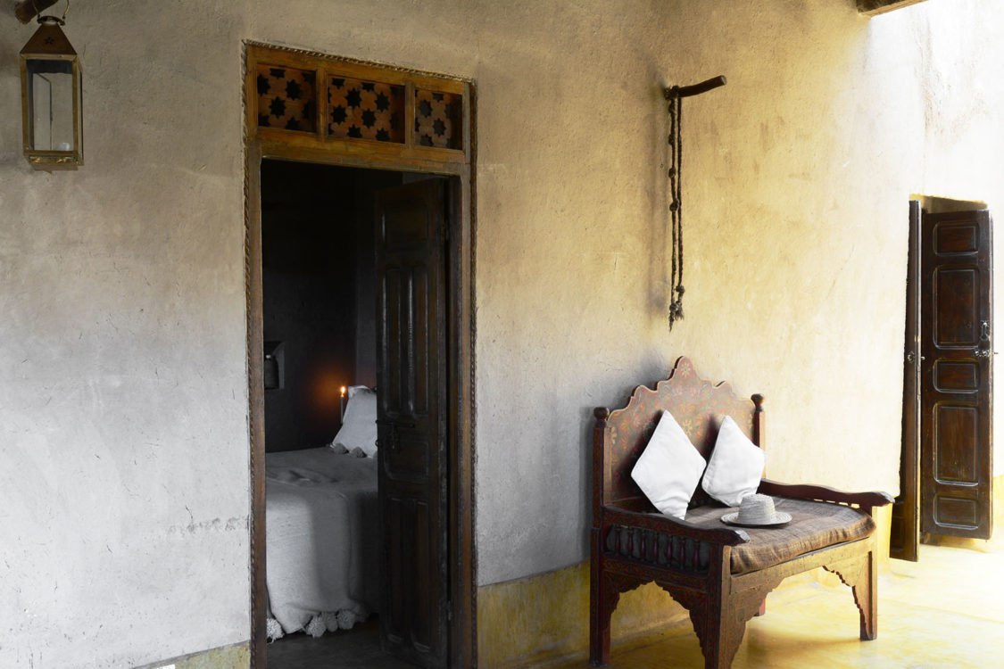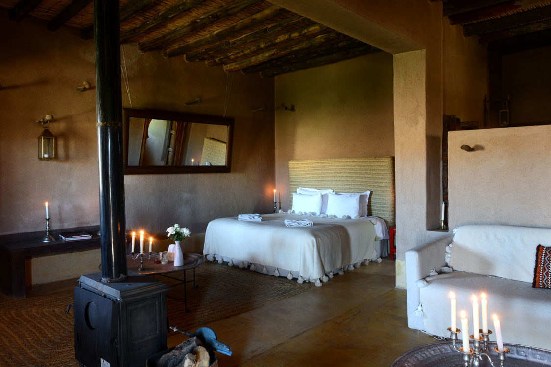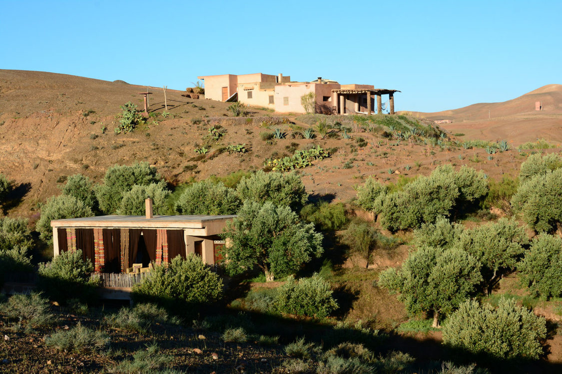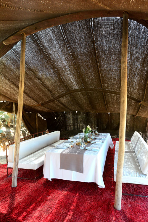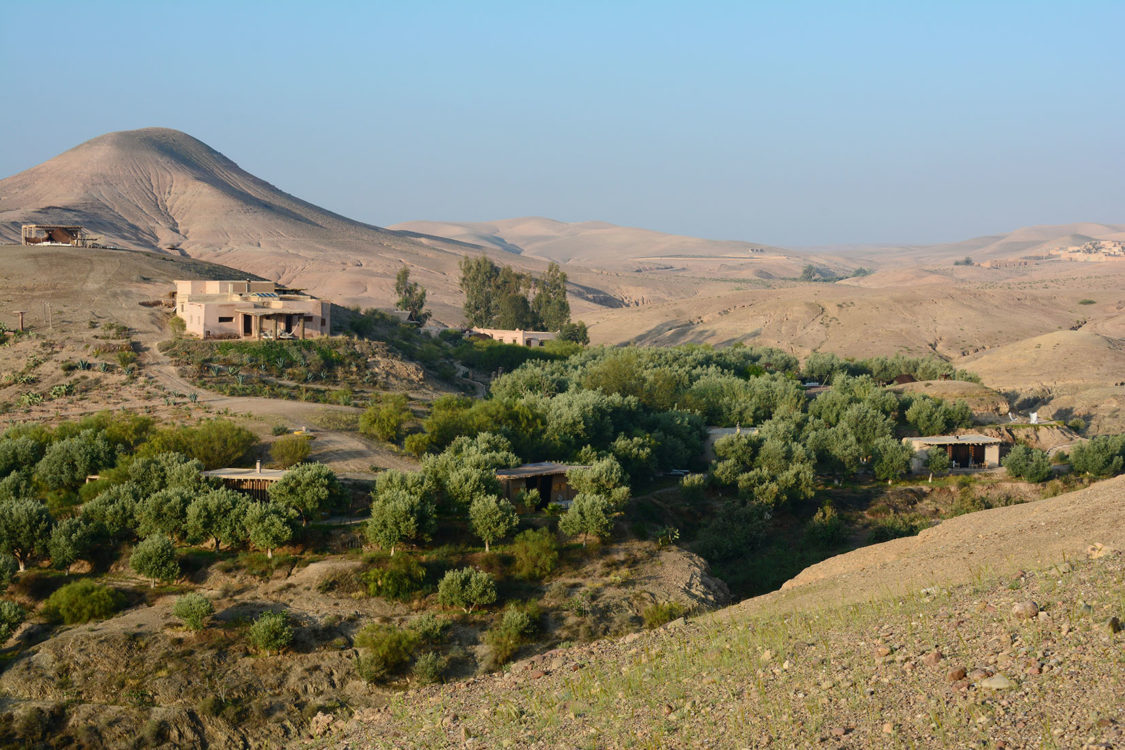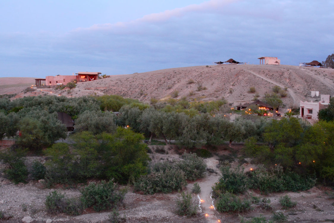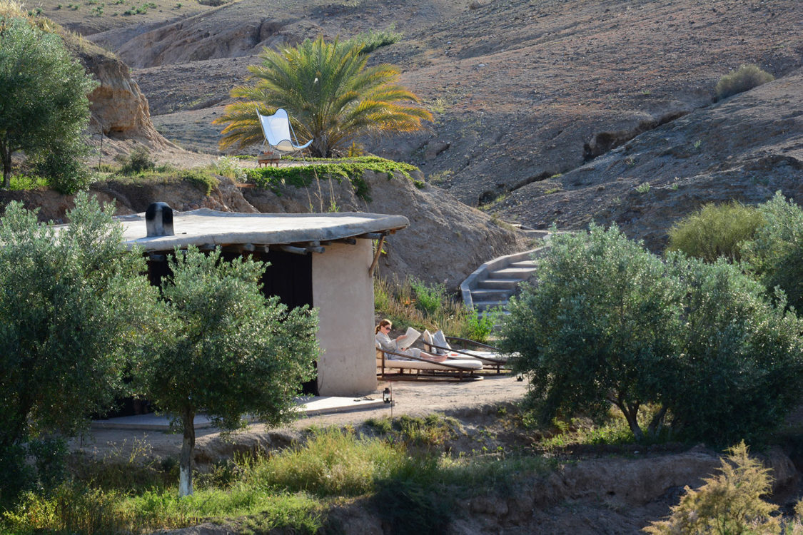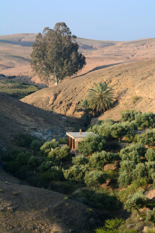 À trente kilomètres de Marrakech, blottie au cœur des terres arides des monts Agafay, La Pause est un rêve imaginé par Frédéric Alaime et sa femme. Sur sept hectares de désert et comme dissimulées dans le creux d’un oued verdoyant, quatre maisons de pisé abritent une poignée de chambres éclairées à la lueur des bougies. Tapis de laine, dinanderie, coussins bridés, dais en lin… la décoration se veut à la fois simple et sophistiquée afin de créer un univers en lien avec les paysages magnifiques de l’Agafay et de l’Atlas.
