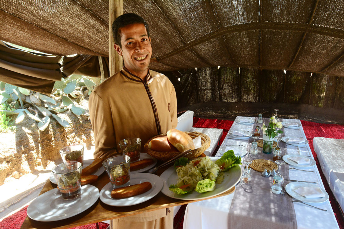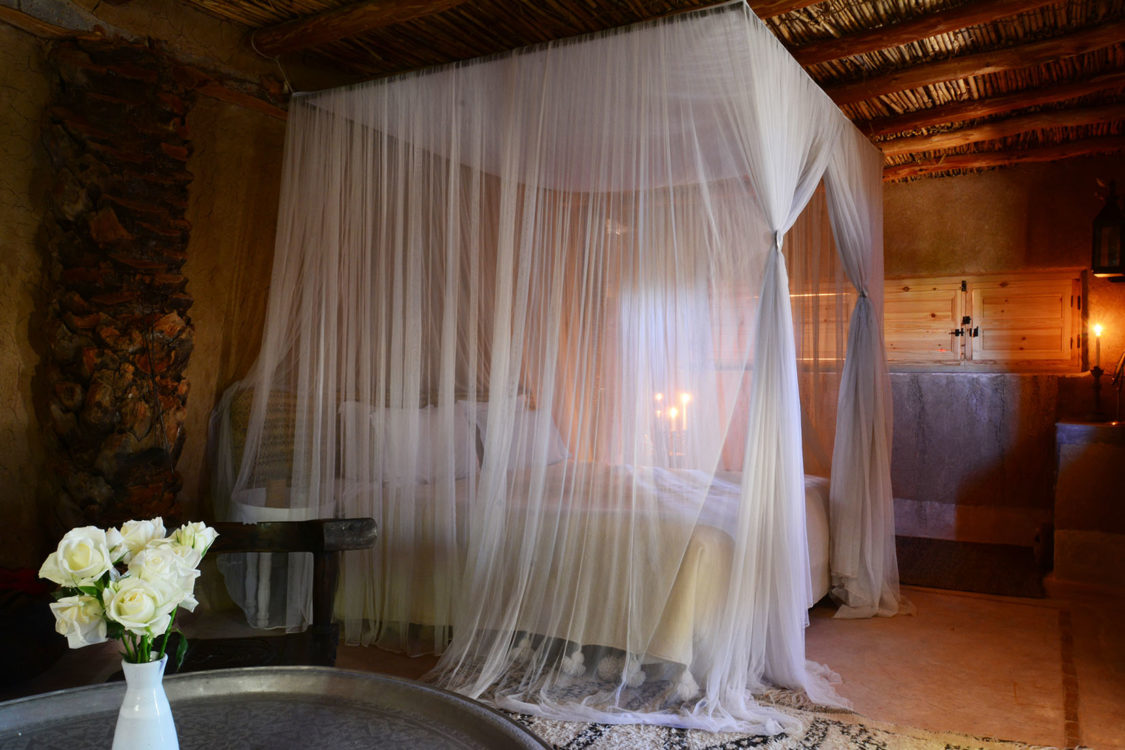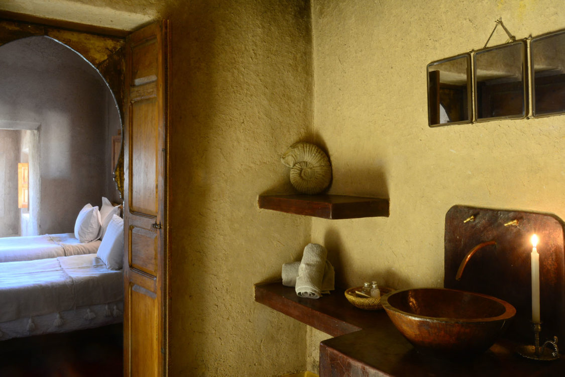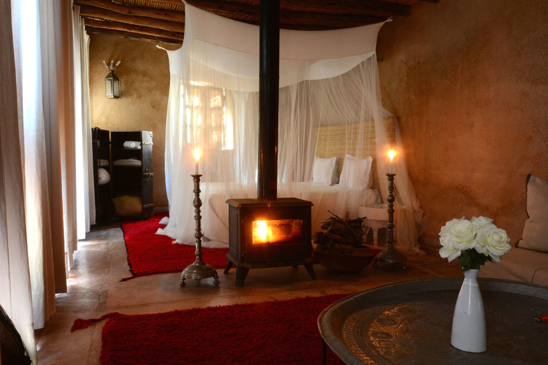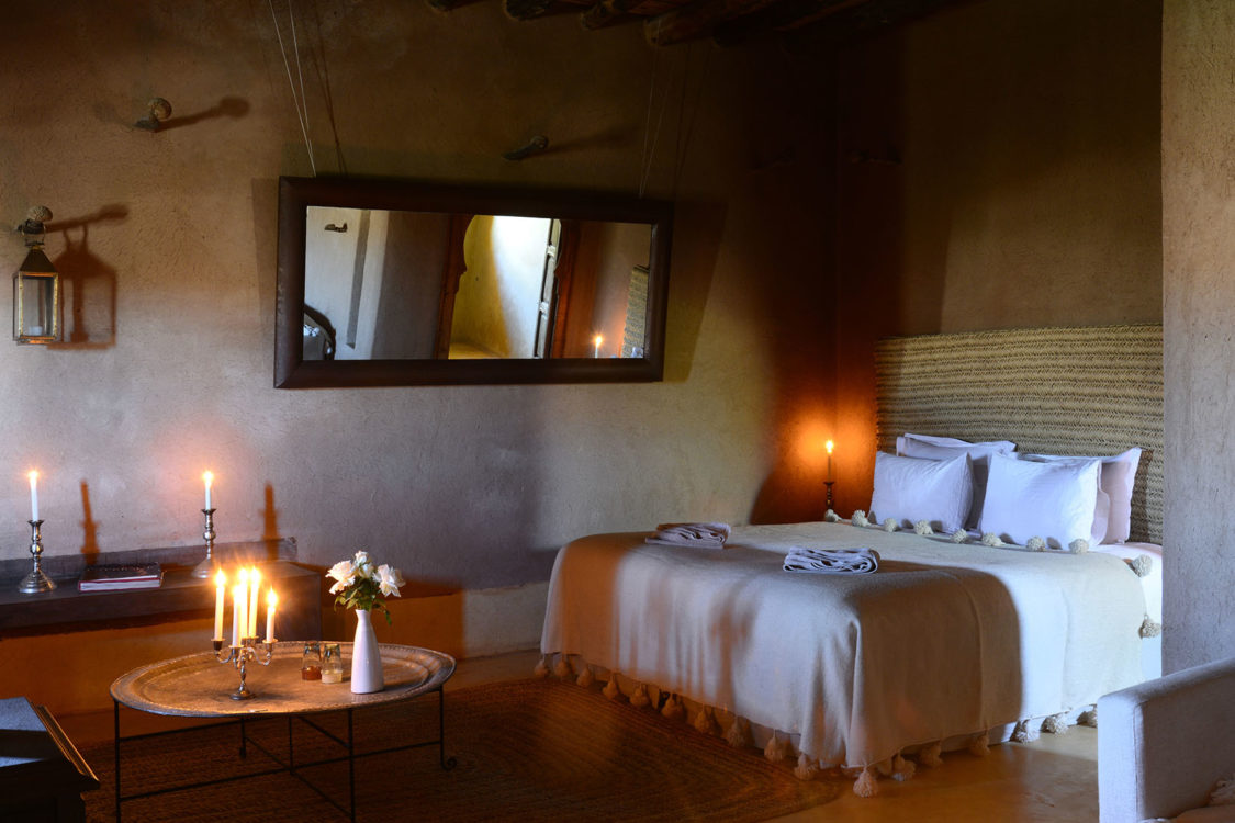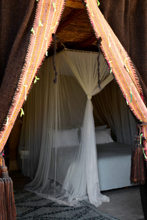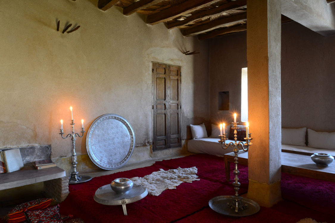 À trente kilomètres de Marrakech, blottie au cœur des terres arides des monts Agafay, La Pause est un rêve imaginé par Frédéric Alaime et sa femme. Sur sept hectares de désert et comme dissimulées dans le creux d’un oued verdoyant, quatre maisons de pisé abritent une poignée de chambres éclairées à la lueur des bougies. Tapis de laine, dinanderie, coussins bridés, dais en lin… la décoration se veut à la fois simple et sophistiquée afin de créer un univers en lien avec les paysages magnifiques de l’Agafay et de l’Atlas.
