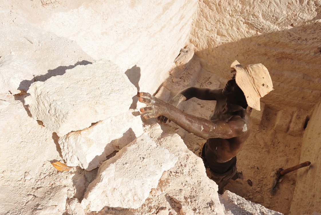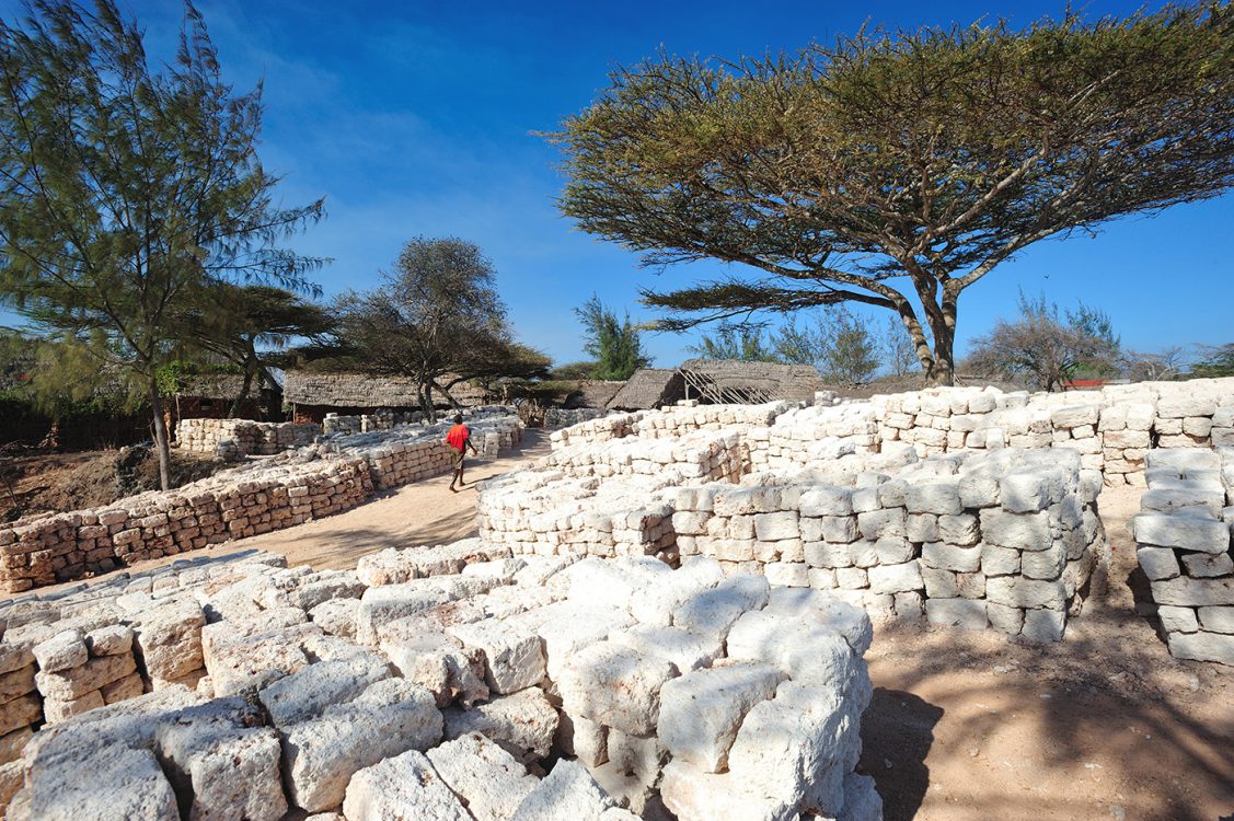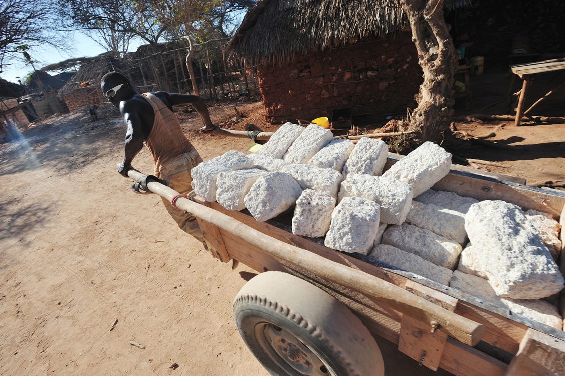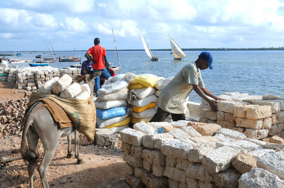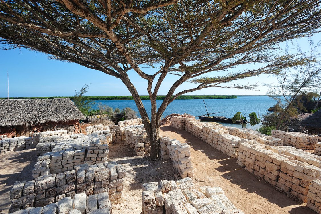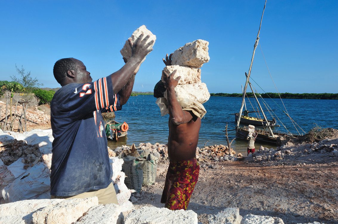 Au Kenya, sur l’île de Manda, située en face de Lamu, ces carrières se visitent. Le travail des tailleurs est harassant. Chacun creuse son propre trou et taille des blocs rectangulaires avec un pic, le tout sous le soleil et sans eau. Une fois taillés, ces blocs sont mis à durcir au soleil, rassemblés puis portés à dos d’homme ou d’âne vers la plage où ils seront chargés dans des dhows à destination des ports de la côte (Lamu, Mombasa, Zanzibar…).