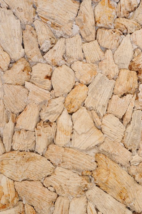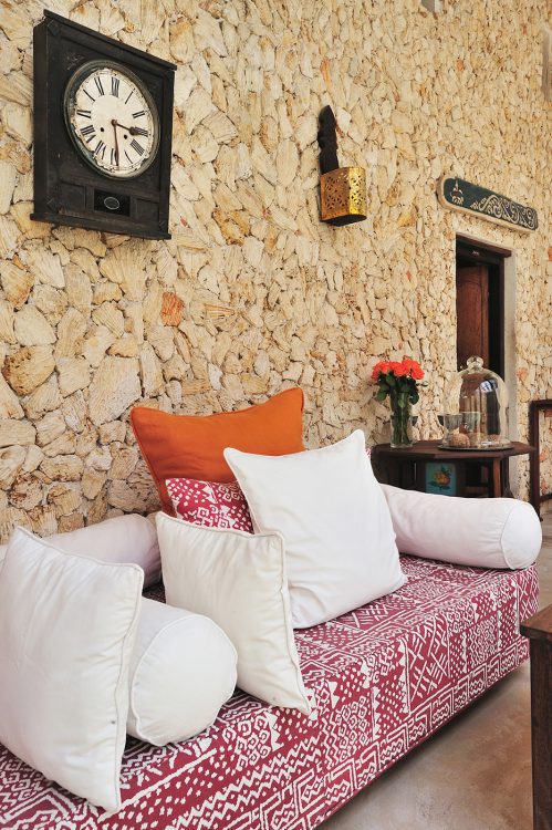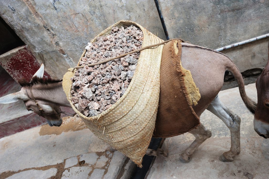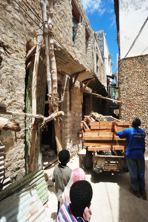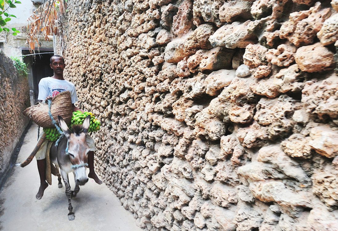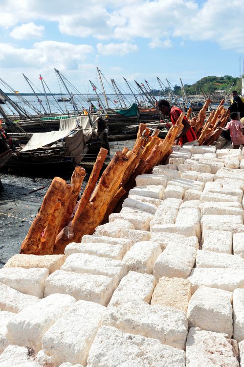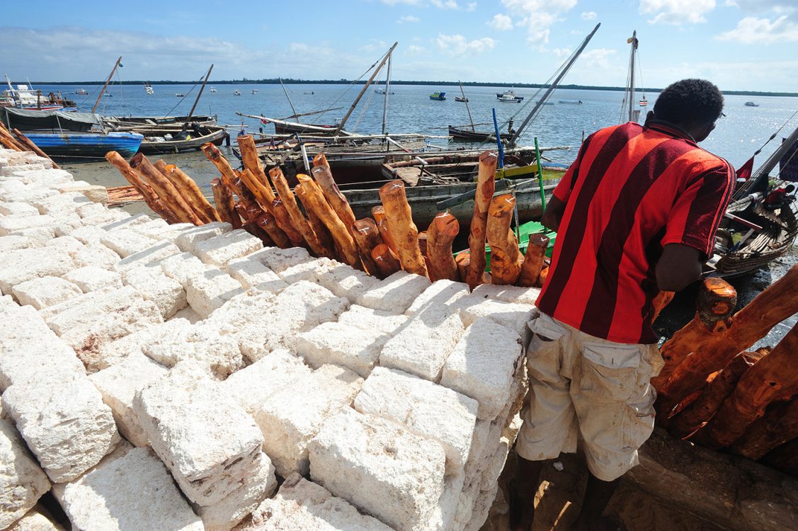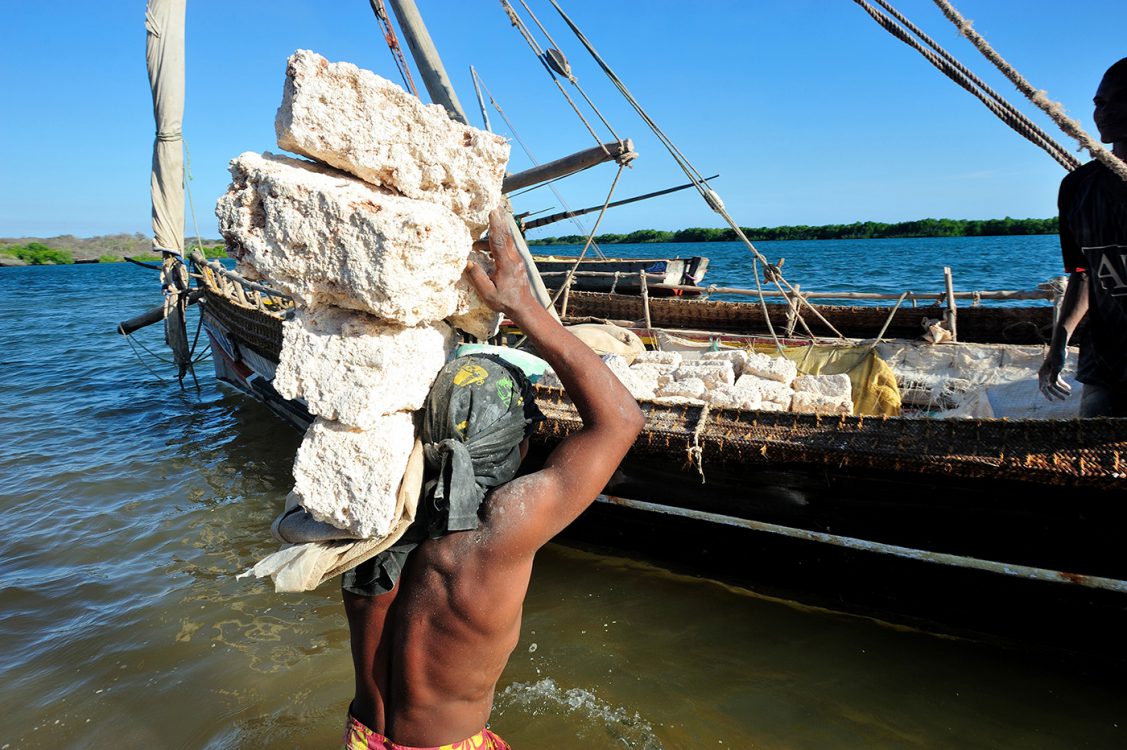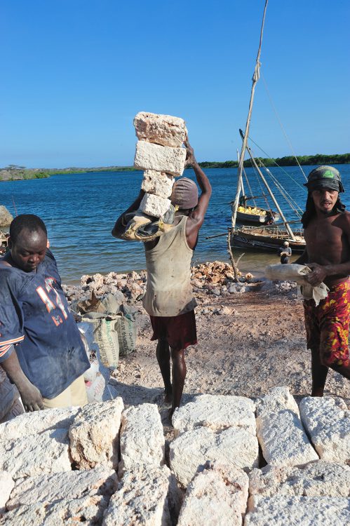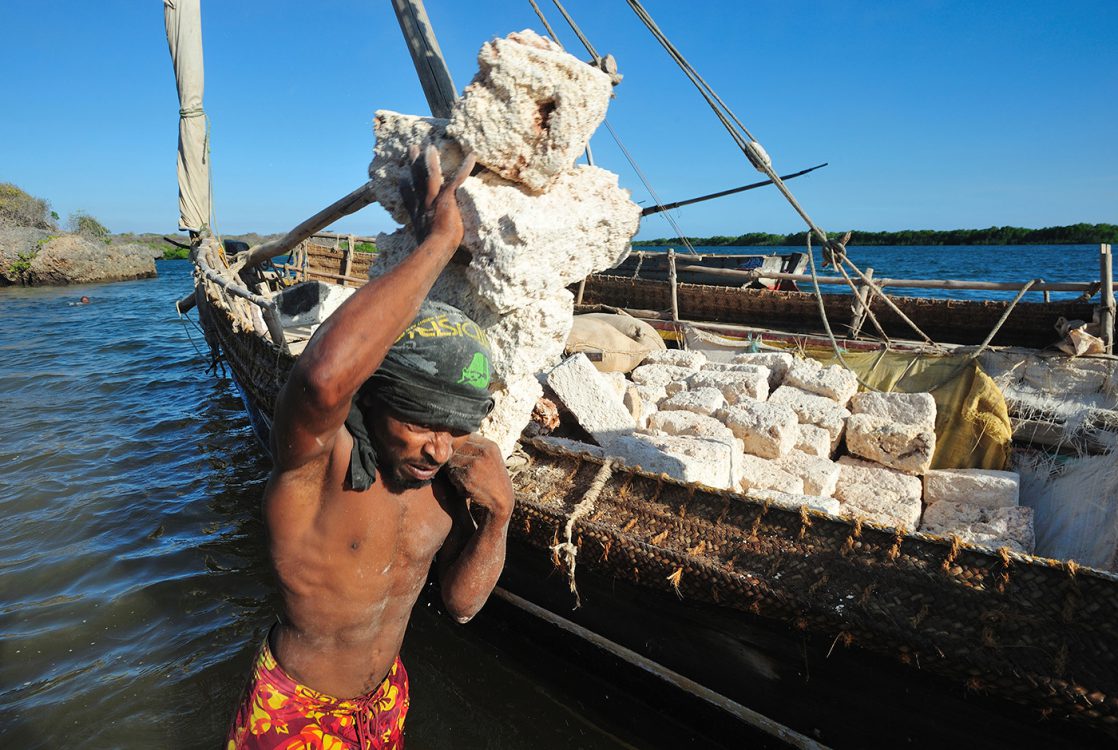 Compact et léger, facilement accessible, le corail est la pierre angulaire de tous les palais de Zanzibar et de Lamu mais aussi des maisons, plus humbles, des pêcheurs de la côte Est de l’Afrique. Les gisements coralliens se rencontrent presque partout sur les côtes. Mais tous ne sont pas bons à exploiter. Les plus récents sont souvent trop mous et tous les coraux ne se valent pas, présentent des différences considérables du point de vue dureté, consistance et résistance. Il faut donc trouver les plus anciens possibles, enlever la couche supérieure mélangée avec la terre et creuser un mètre ou deux pour atteindre la bonne densité.